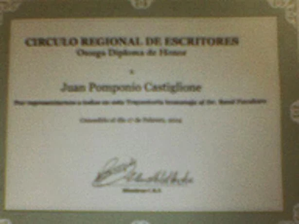 El lunes 17 de Febrero el presidente del circulo cooperativo Regional de escritores Néstor O Salgado y la Vice-Presidenta Mabel Andreu entregaron al escritor un Diploma de Honor y un libro de regalo por representarnos a todos los Argentinos en esta travesía homenaje al Dr Rene Favaloro; dejado colocamos el link para que pueda escuchar la entrevista que le realizo Nestor O Salgado para su Programa radial Razones para vivirhttp://www.spreaker.com/user/fmsur/entrevista-al-escritor-juan-pomponio